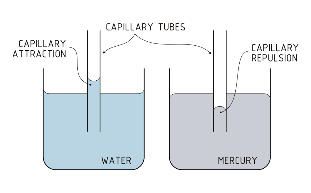 It’s why towels pick up moisture, why sap rises up plants and trees, and why damp rises up walls. The mechanism that drives capillary action is why the insects known as water-boatmen can walk on the surface of ponds, why rain falls in drops, and why liquid spilled on a surface forms a pool.
