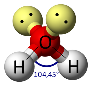 In a water molecule, two of these legs are Hydrogen atoms each sharing two electrons with the central oxygen, and two are just the force exerted by pairs of ‘lone electrons’ – electrons that pair up with opposite spins because that forms a lower-energy state.